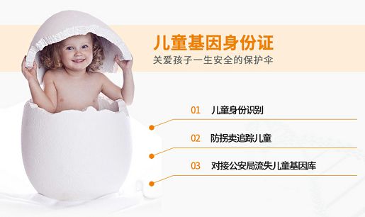 儿童基因DNA身份证也是针对被拐儿童、失散儿童快速找到亲生父母的最有效、最直接的工具。万一孩子不幸走失,父母可以将孩子的基因身份证数据提供给公安部门作为补充物证。当孩子的基因数据通过黑户入户基因检测、或由公安机关打拐解救后帮助进行检测等途径第二次出现在数据库中时,与原有数据进行比对识别,配对成功后,可及时认亲。